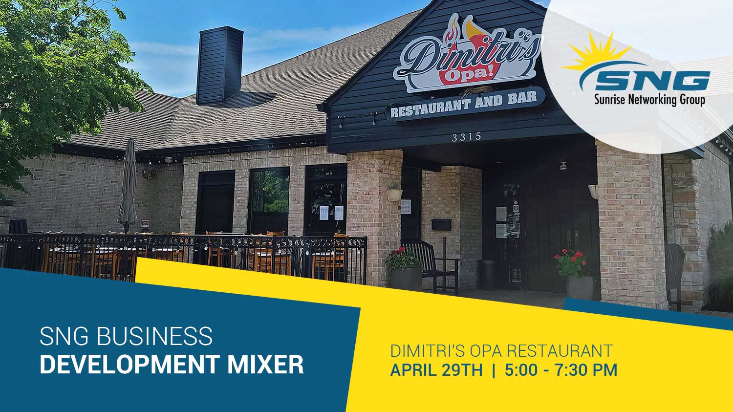 The Sunrise Networking Group invites you to an evening out with SNG members, entrepreneurs, executives, and career-minded professionals on Thursday, April 29th at Dimitri’s Opa Restaurant.