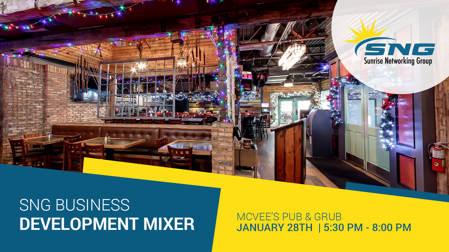 The Sunrise Networking Group invites you to an evening out with SNG members, entrepreneurs, executives, and career-minded professionals on Tuesday, January 28th at McVee’s Pub & Grub.