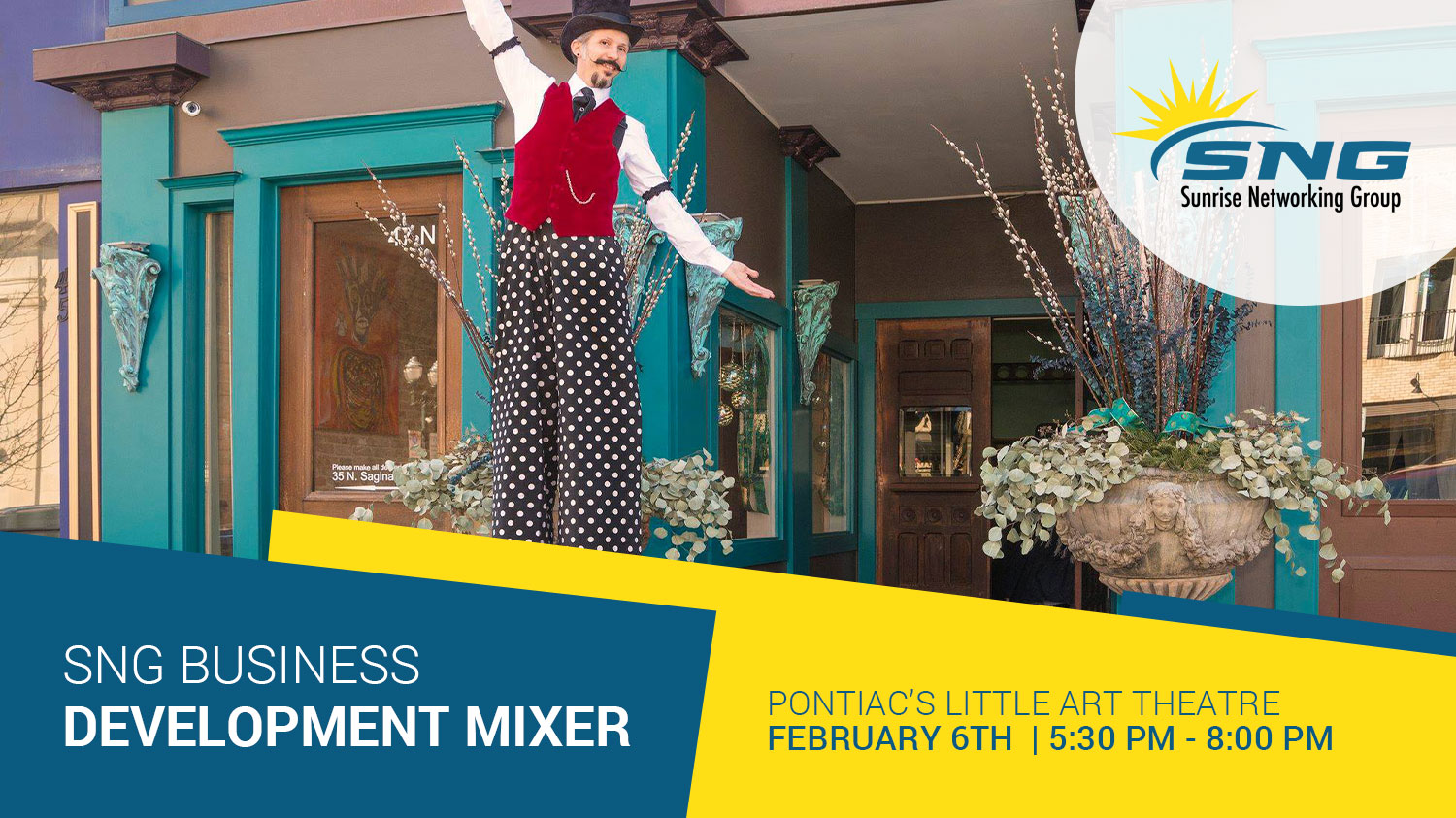 The Sunrise Networking Group invites you to an evening out with SNG members, entrepreneurs, executives, and career-minded professionals on Thursday, February 6th at Pontiac’s Little Art Theatre.