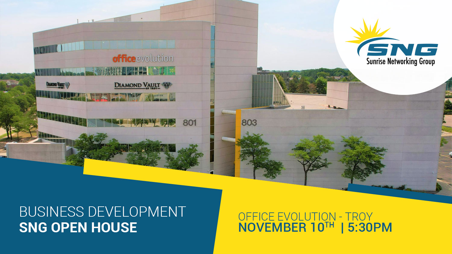 The Sunrise Networking Group invites you to an evening out with SNG members, entrepreneurs, executives, and career-minded professionals on Thursday, November 10th at Office Evolution in Troy.