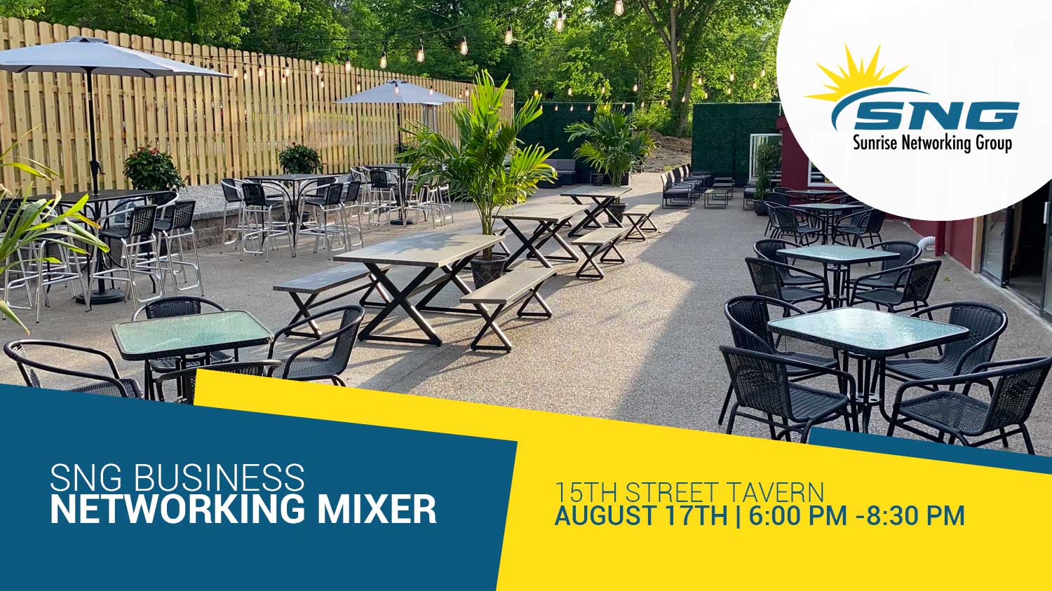 The Sunrise Networking Group invites you to an evening out with SNG members, entrepreneurs, executives, and career-minded professionals on Monday, August 17th at 15th Street Tavern.