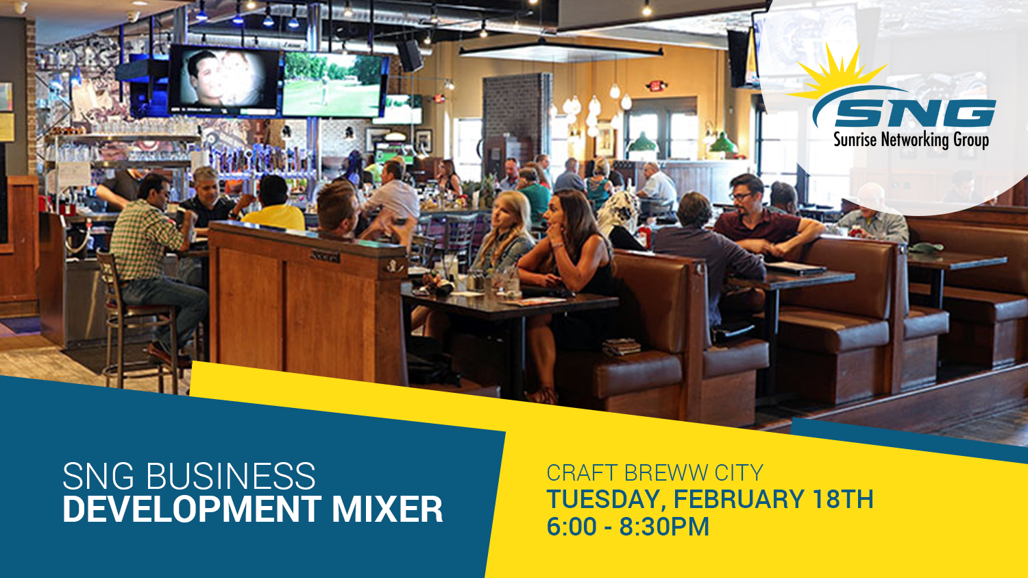 The Sunrise Networking Group invites you to an evening out with SNG members, entrepreneurs, executives, and career-minded professionals on Tuesday, February 18th at Craft Breww City.